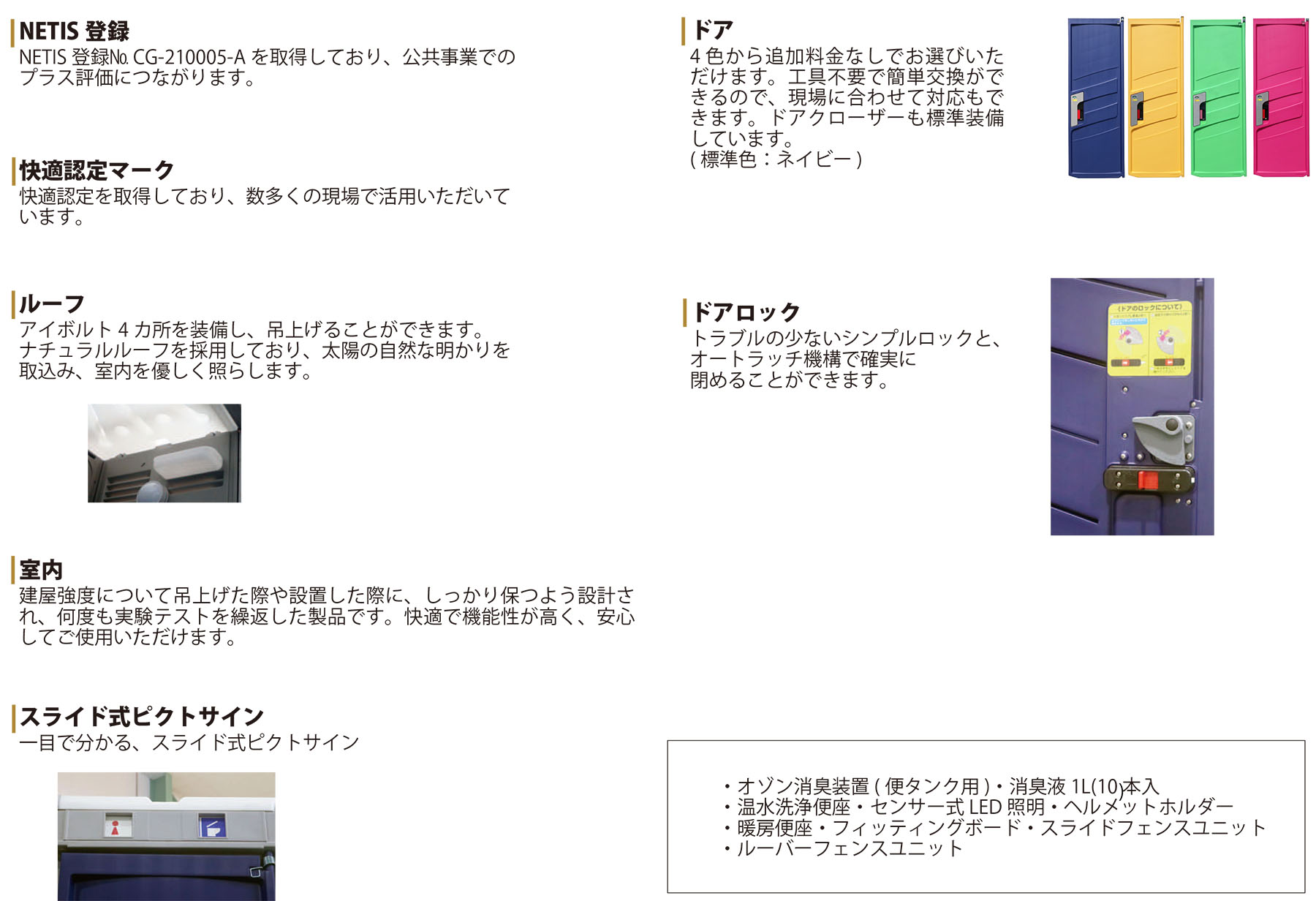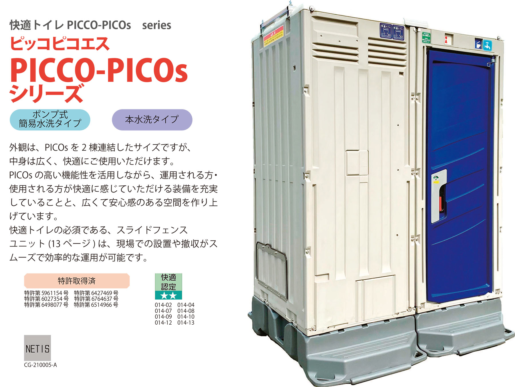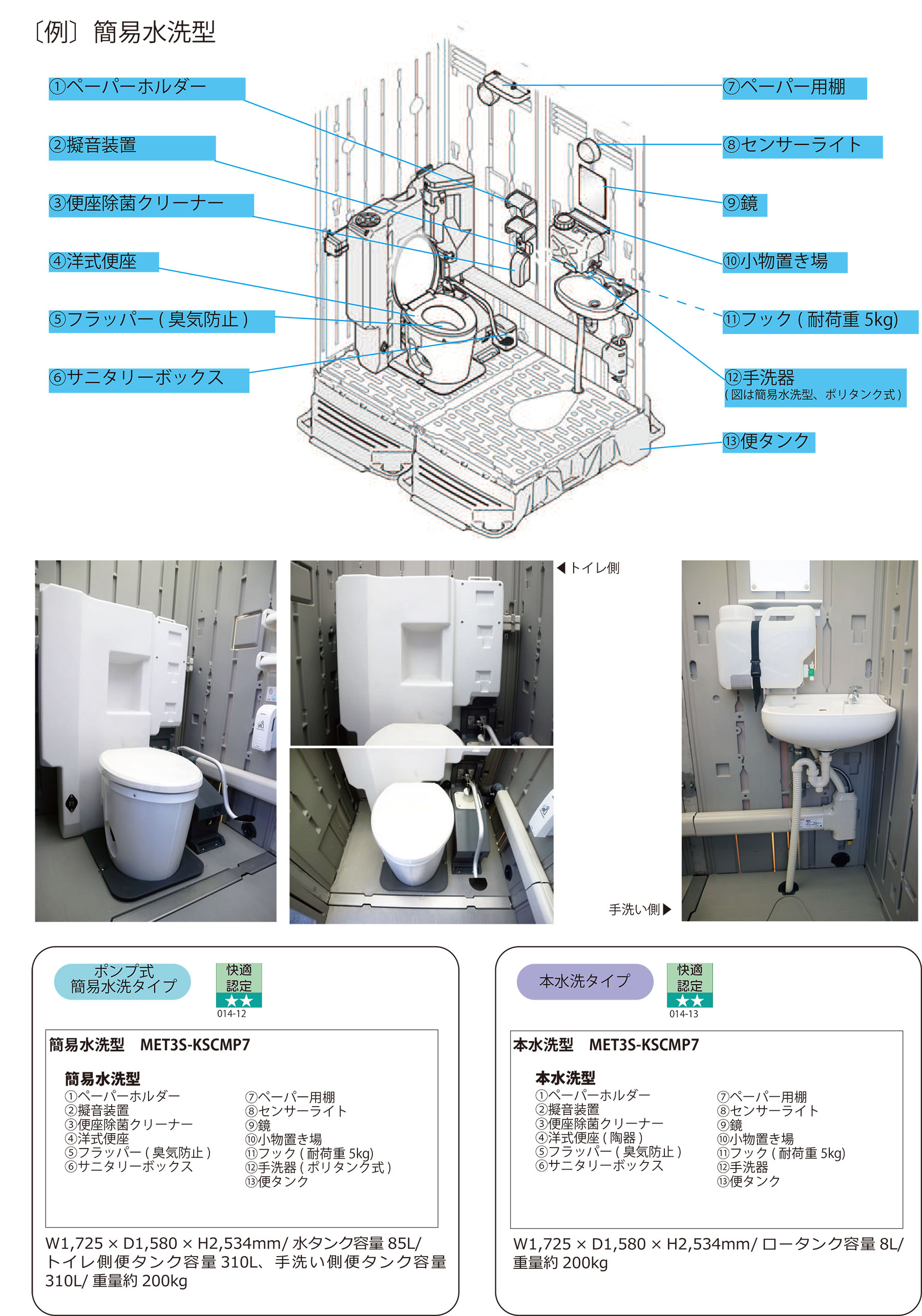 快適トイレ PICCO-PICO S 装備・特徴 詳細 諸元など(簡易水洗仕様) 製品名 快適トイレ PICCO-PICO S 型式 MET3S-KSCMP7 外寸法 1580mm×1725mm×2534mm 内寸法 1053mm×1655mm×2010mm 重量 200kg 図面(PDF) 簡易水洗 本水洗 ※各種仕様を予告なく変更する場合がございますが、予めご了承下さい。